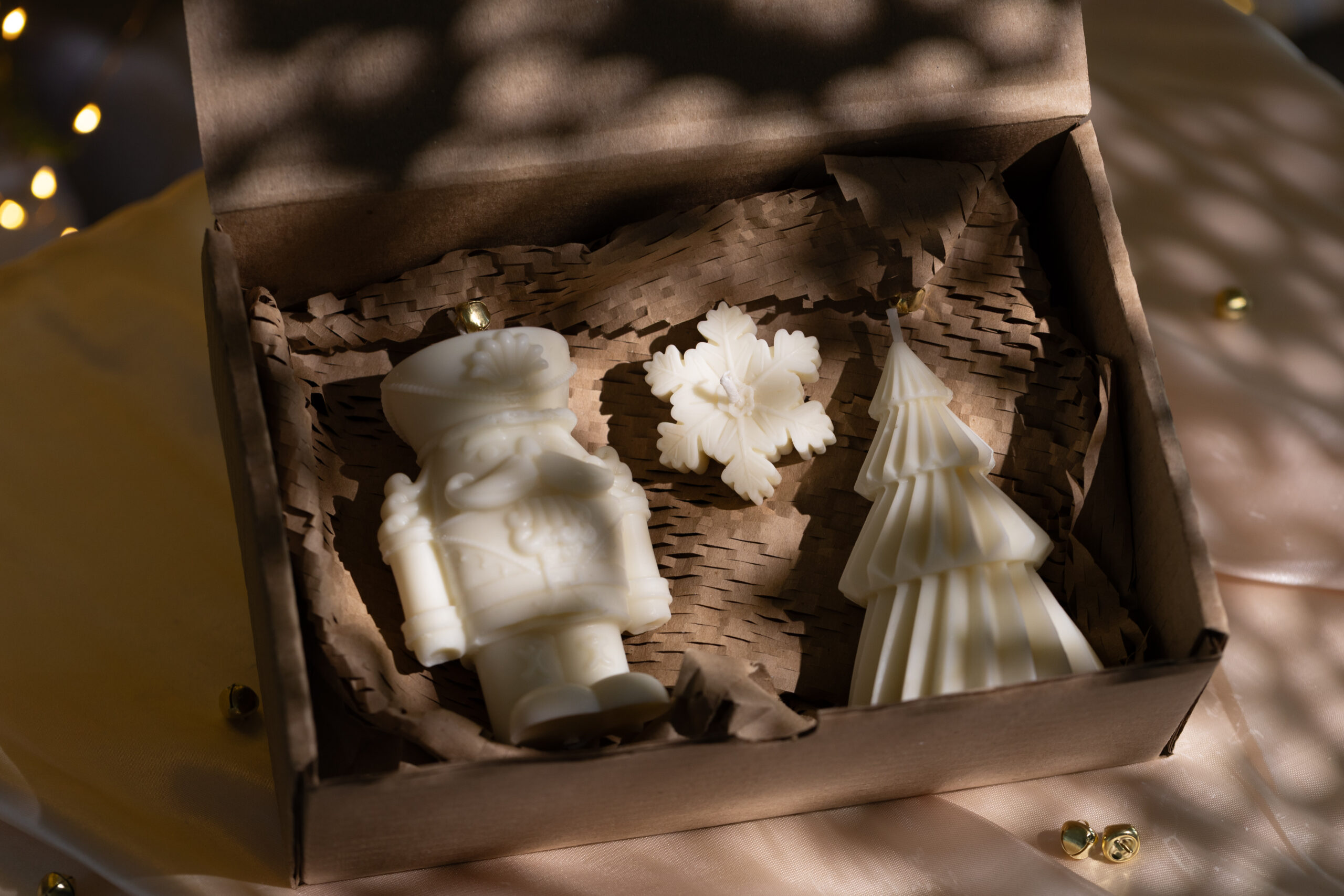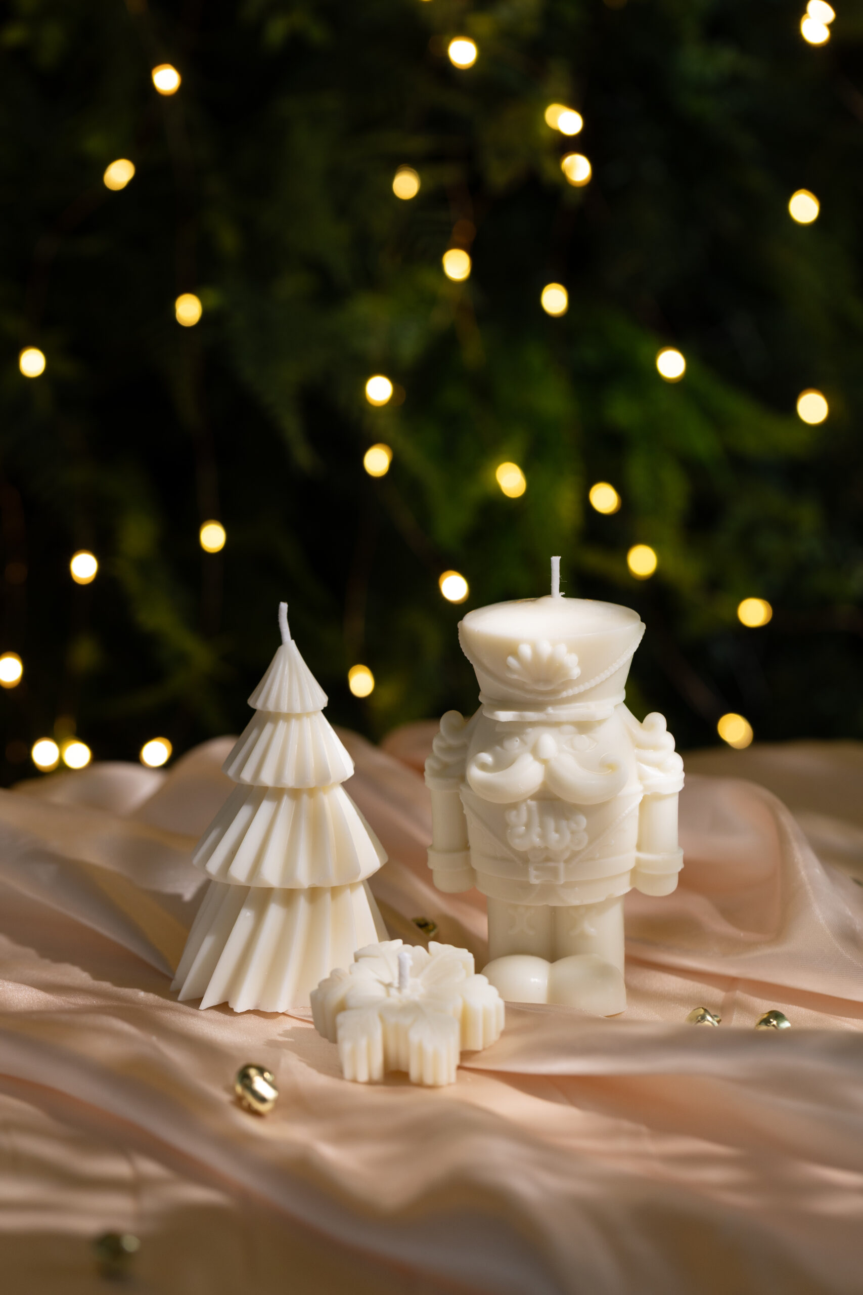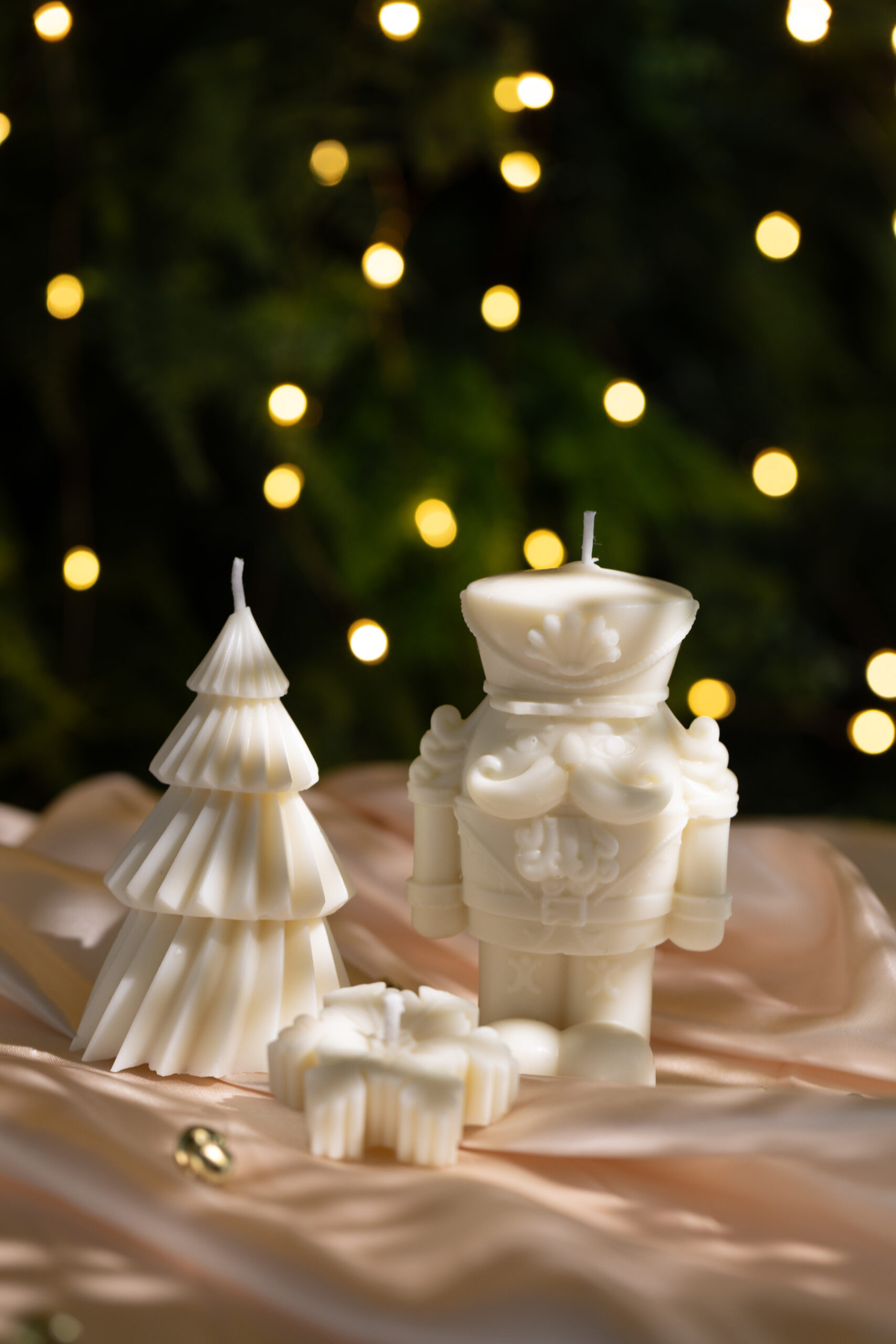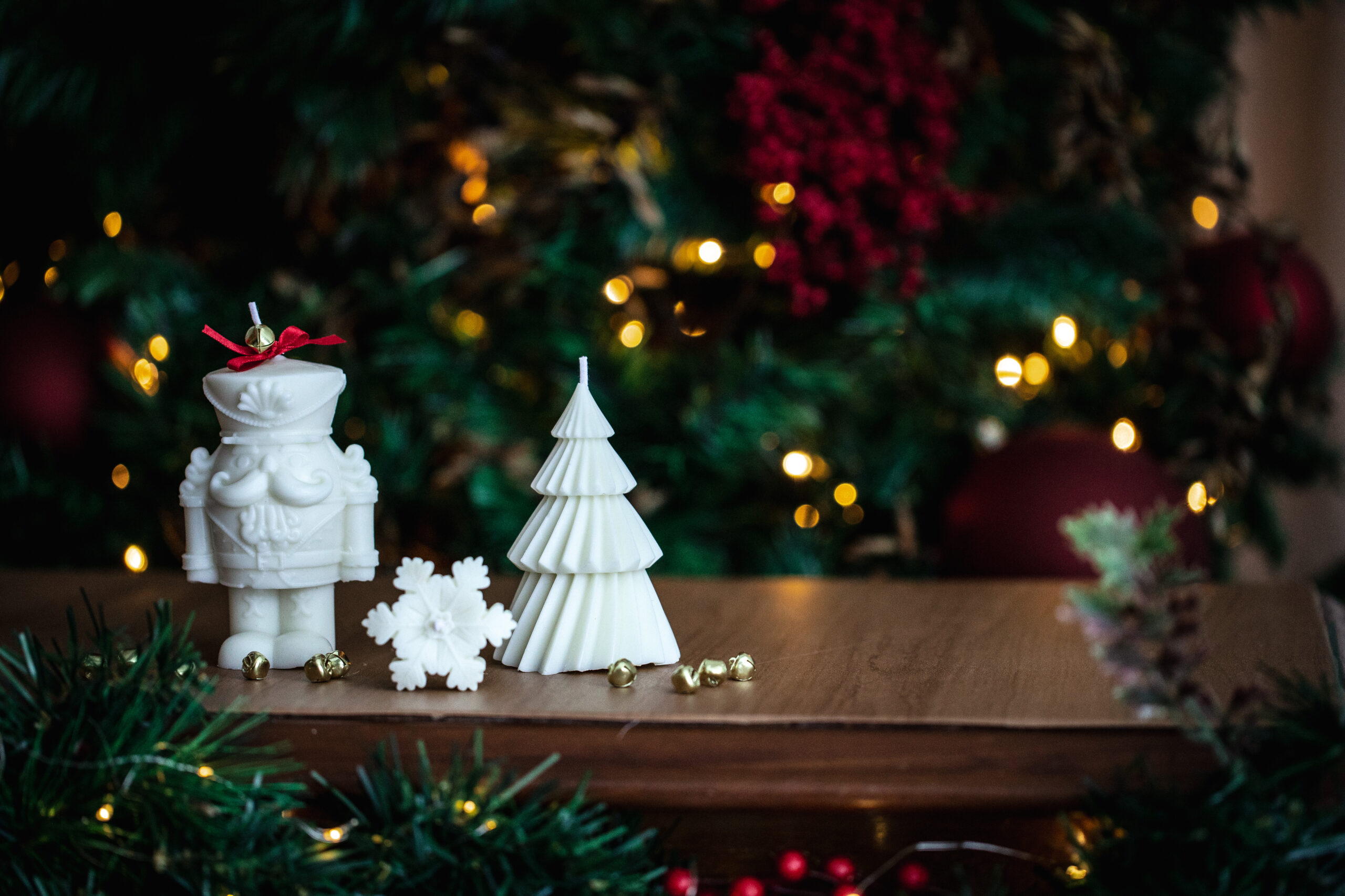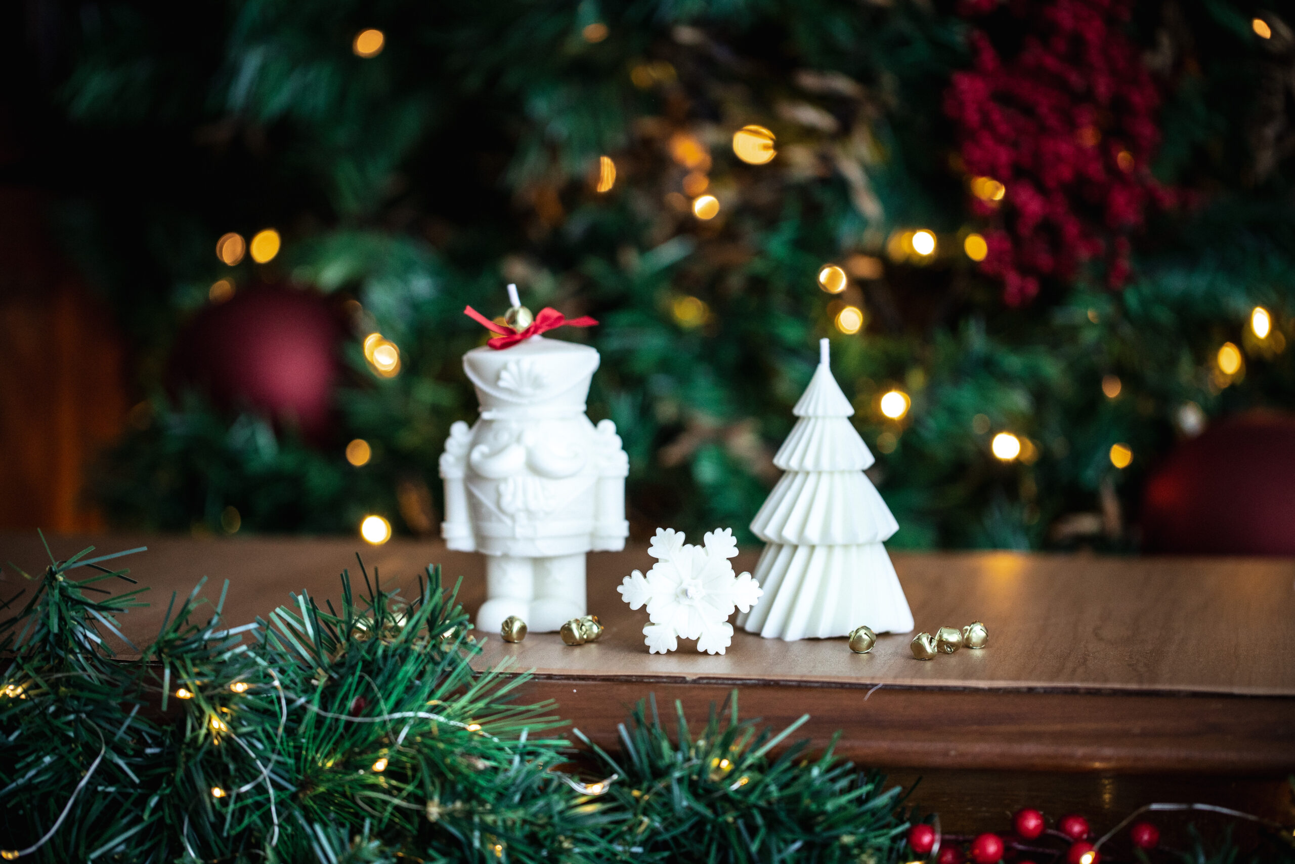 As velas Quebra-Nozes e Árvore de Natal, ambas sem perfume, são perfeitas para decorar mesas natalinas sem interferir nos aromas da ceia.